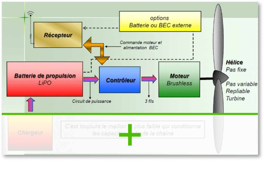 Décrire chaque élément d’une motorisation électrique, en prenant exclusivement en compte les caractéristiques immédiatement disponibles dans les catalogues et les sites internet des fabricants et distributeurs… Puis les assembler pour motoriser votre modèle.